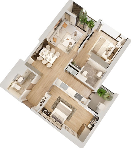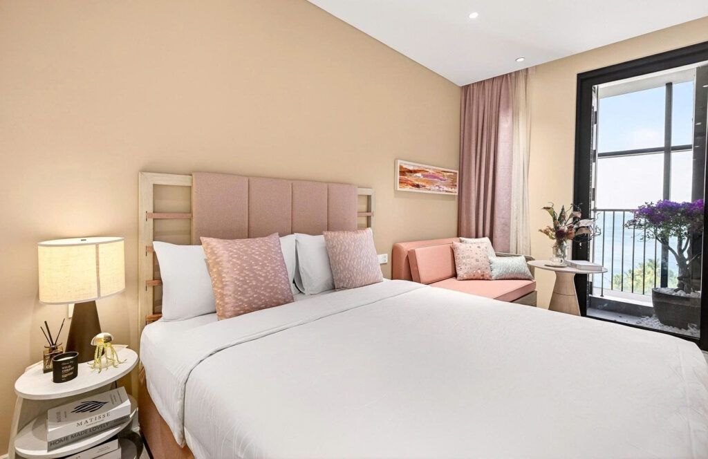 Căn hộ studio có thiết kế nhỏ gọn, không gian mở và tối giản, phù hợp với người độc thân hoặc khách hàng trẻ. Căn hộ 1 phòng ngủ có diện tích lớn hơn, bố trí phòng ngủ riêng biệt, thích hợp cho chuyên gia, cặp đôi hoặc gia đình nhỏ. Với các gia đình có nhu cầu không gian rộng rãi hơn, căn hộ 2 phòng ngủ và 3 phòng ngủ mang lại không gian sinh hoạt thoải mái với phòng khách, bếp và các phòng ngủ tách biệt.